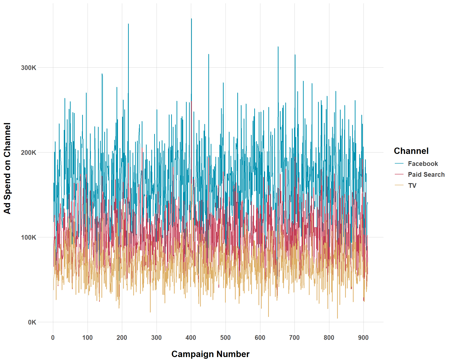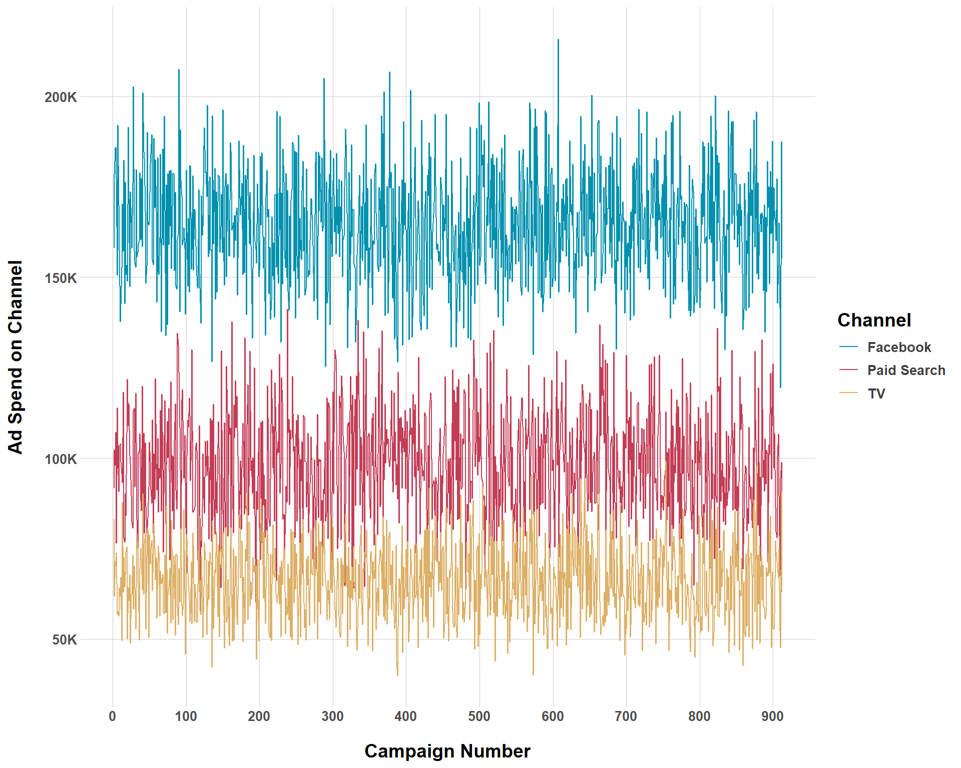Above is a plot showing ad spend by channel over each campaign. Remember that we set our campaign to occur every 2 weeks so the x-axis will not reflect the total number of days in a 5-year period. Let’s walk through each argument to see how this ad spend was generated.