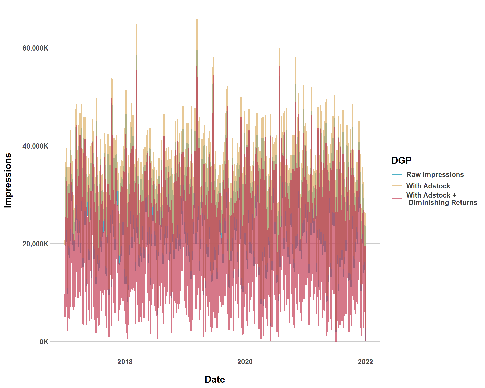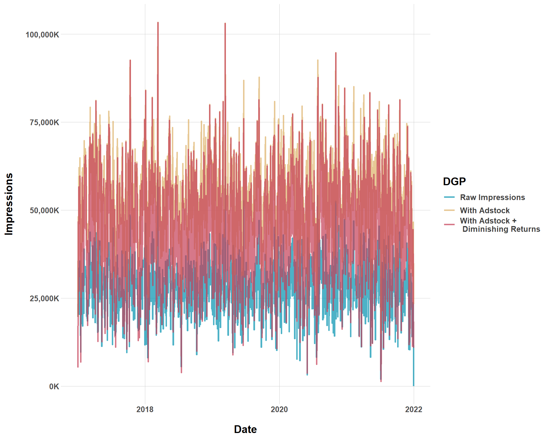 It’s kind of hard to tell, but we see that the data generating process with diminishing returns (unsurprisingly) has the most downward impressions while the DGP with adstock but without diminishing returns has the most upward impressions. This all totally makes sense. A DGP with just adstock means that every campaign has decaying effects, with means every campaign at \(t-1\) gets a little more extra boost from the campaign at time \(t\). However, once we introduce diminishing returns, we get… diminishing returns, which means we are modeling less impressions.