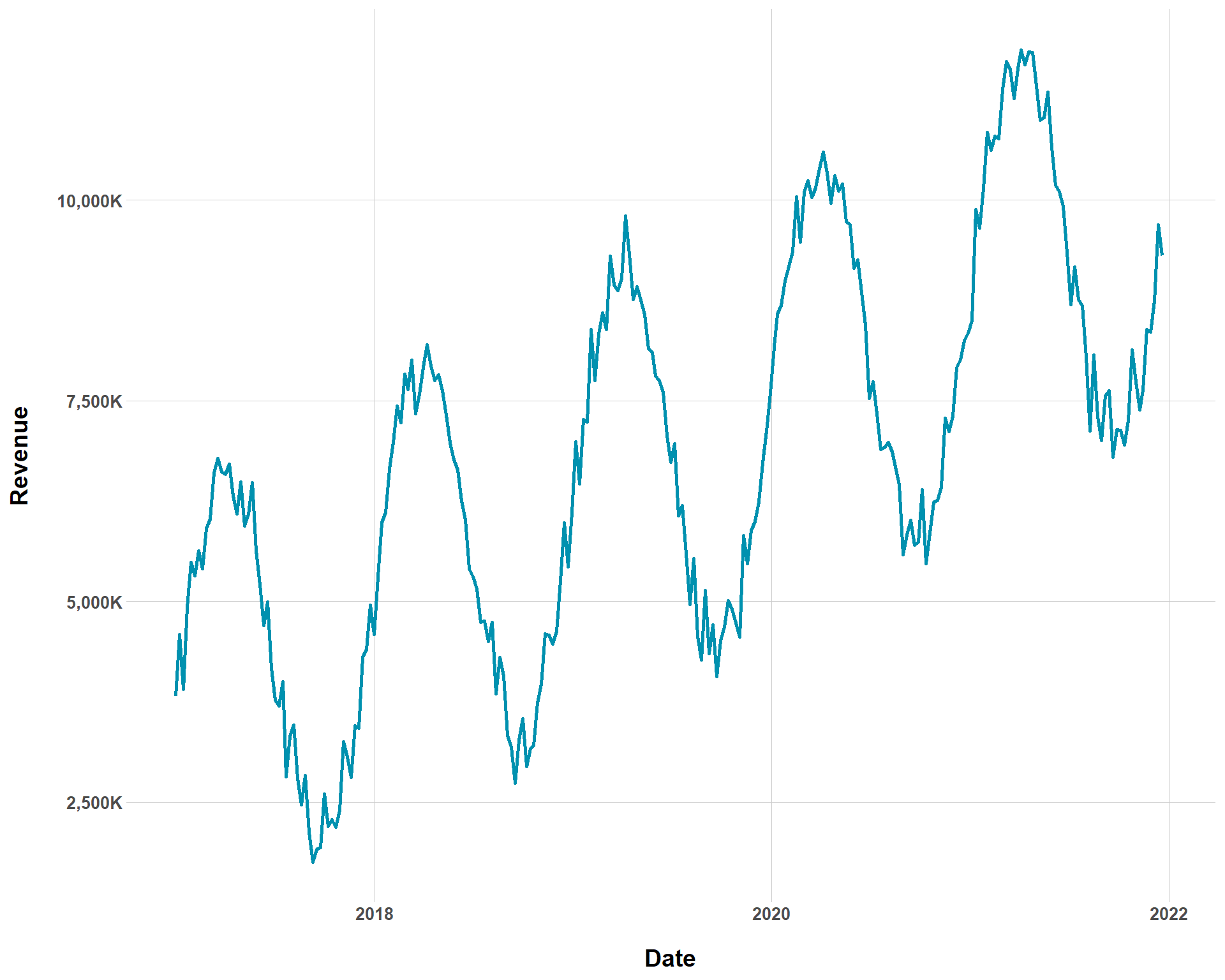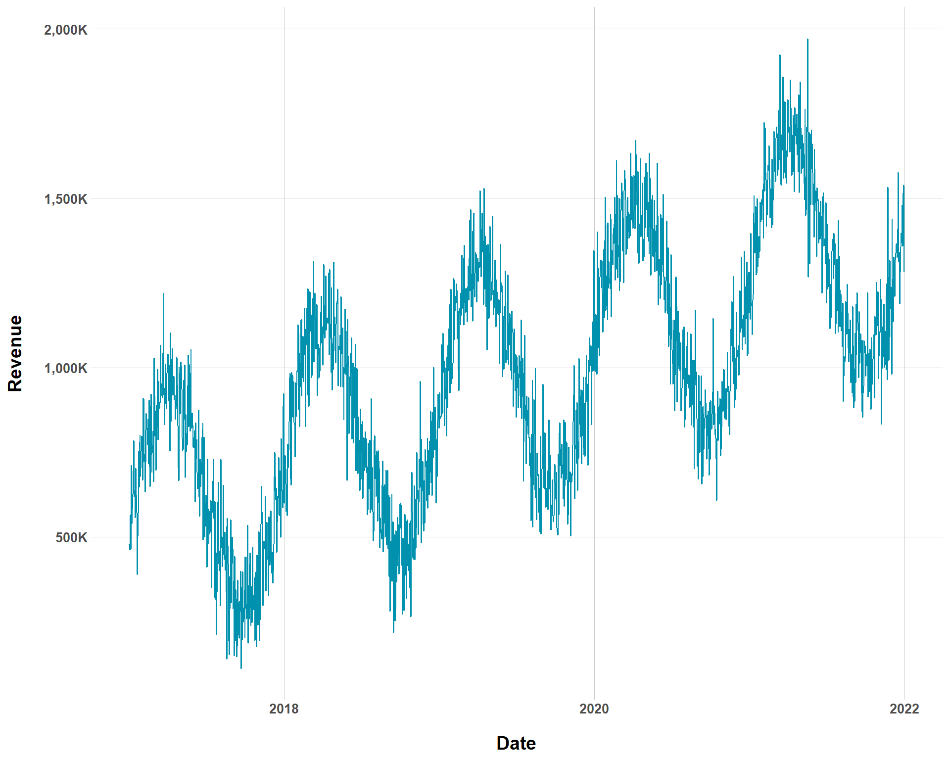 Hey, not everything can be a tidy toy data set. We can also mess with how sharp seasonality swings are in our data. By setting the temp_var to higher values, we can see steeper changes in sales at different times throughout the years.