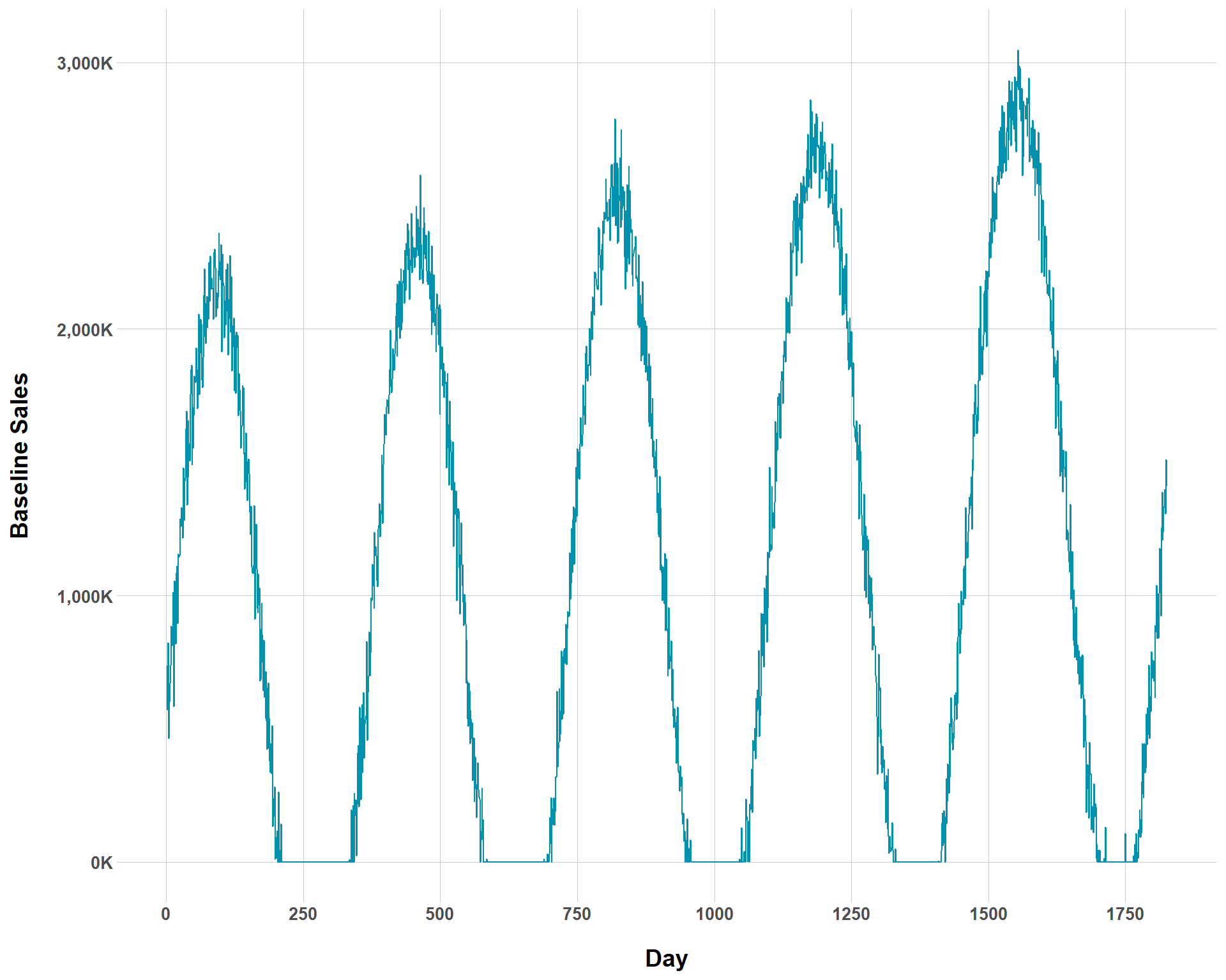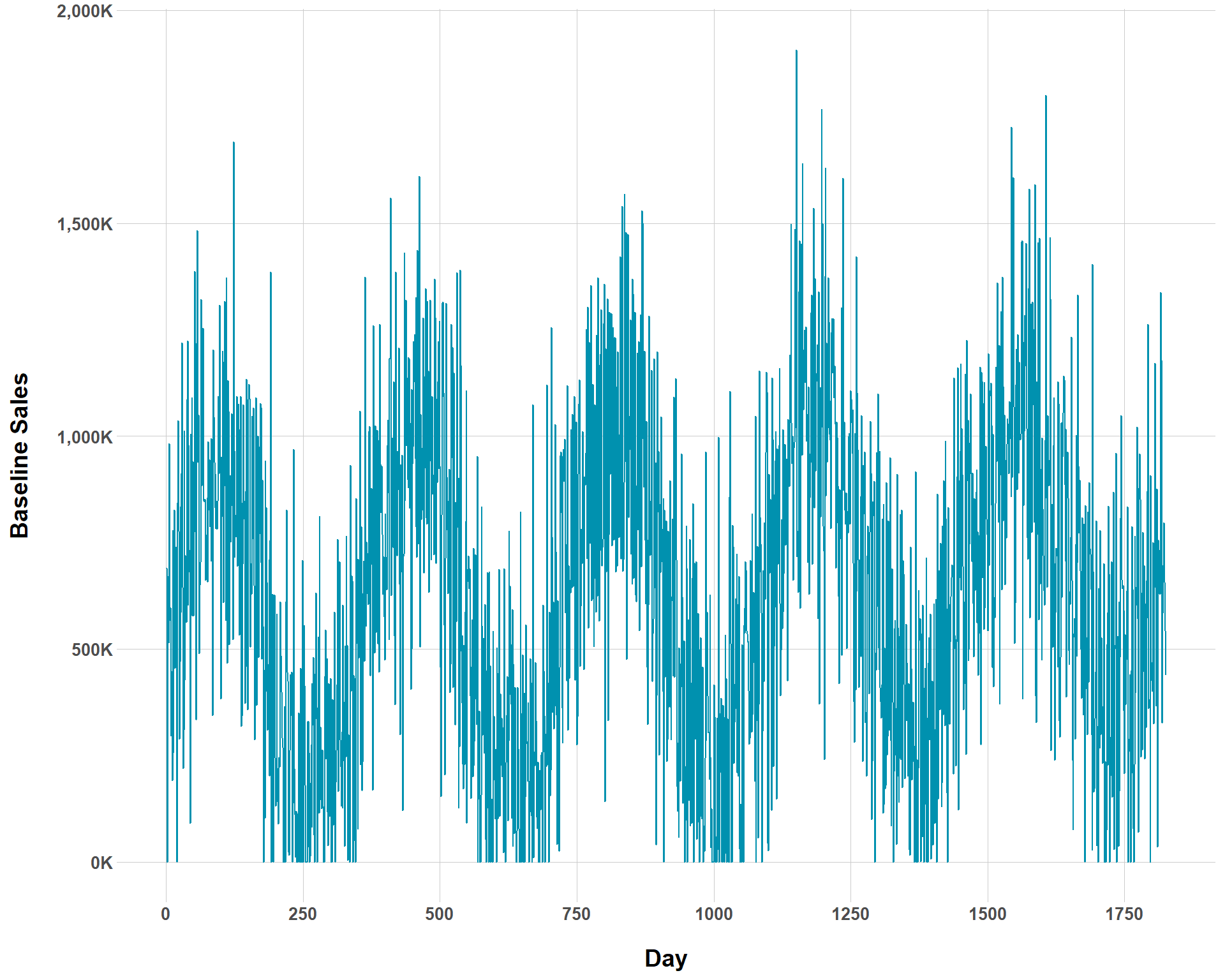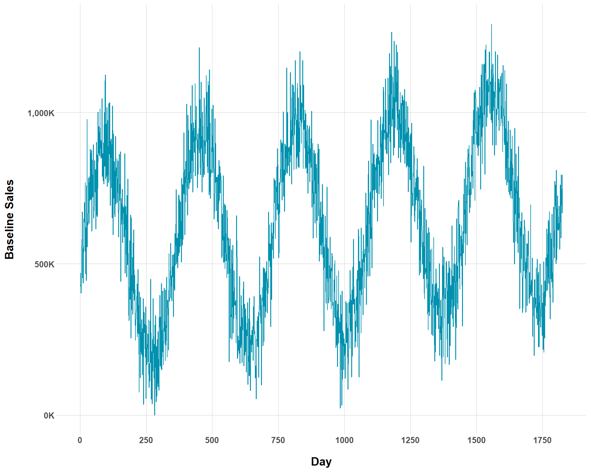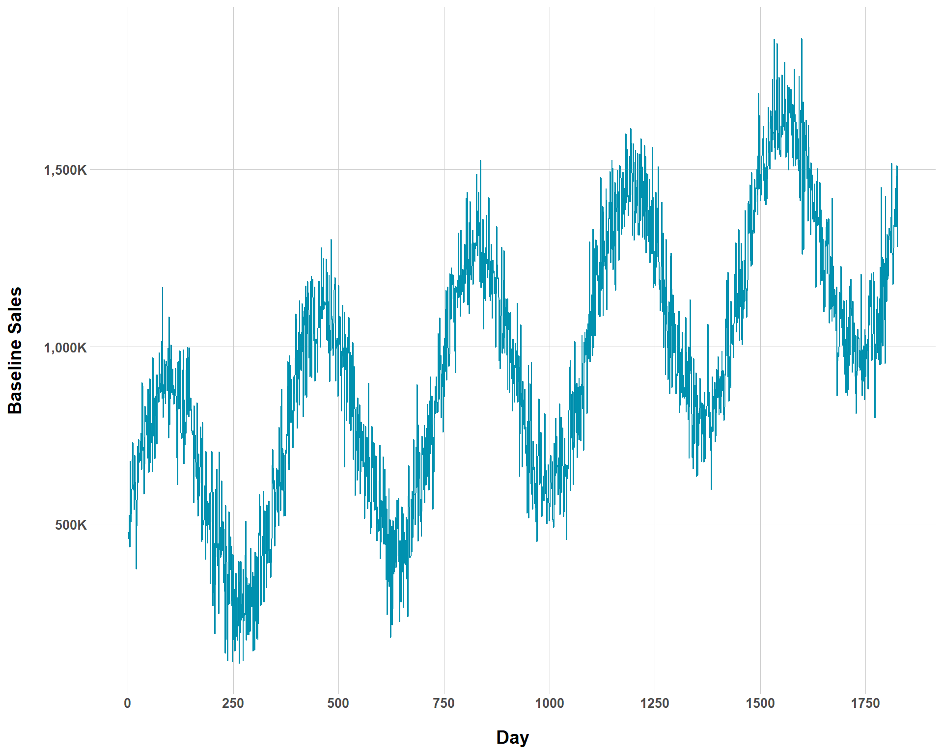 You can see now that the overall rate of baseline growth is now much smaller than before. But we could complicate our ability to even visually determine baseline growth by increasing the amount of noise to the our baseline sales.