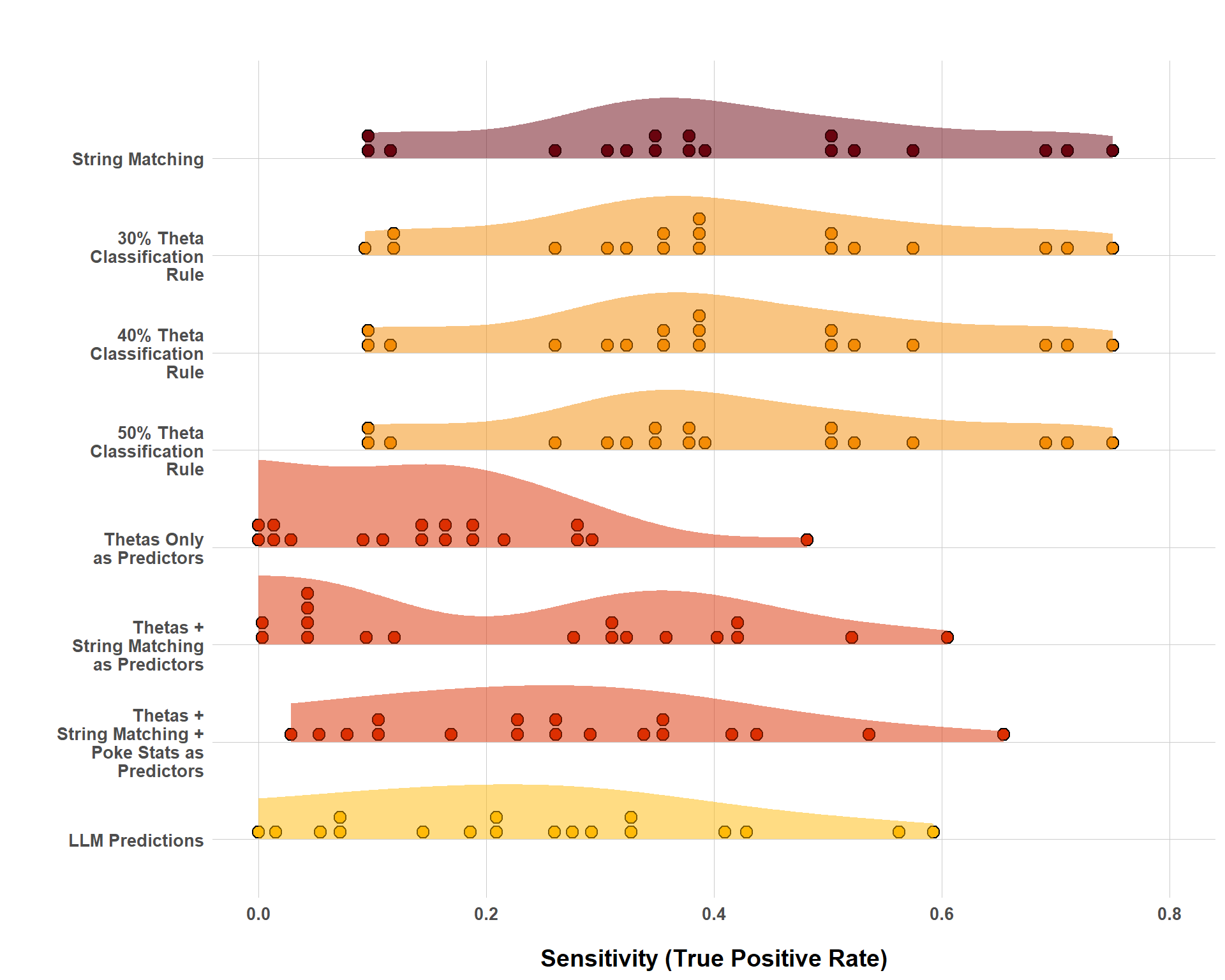 all_metrics <-full_join(string_matching_metrics, theta_model_metrics, by =c("type", "sensitivity", "specificity", "predictors")) |>full_join(theta_sm_model_metrics, by =c("type", "sensitivity", "specificity", "predictors")) |>full_join(theta_sm_stats_model_metrics, by =c("type", "sensitivity", "specificity", "predictors")) |>full_join(theta_30_sm_metrics, by =c("type", "sensitivity", "specificity", "predictors")) |>full_join(theta_40_sm_metrics, by =c("type", "sensitivity", "specificity", "predictors")) |>full_join(theta_50_sm_metrics, by =c("type", "sensitivity", "specificity", "predictors")) |>full_join(llm_metrics, by =c("type", "sensitivity", "specificity", "predictors"))