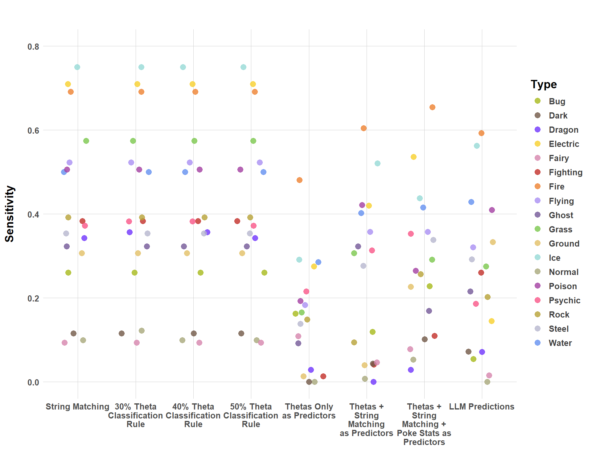# Import the Spreadsheet Chat GPT Gave Mellm_pokemon <-read_excel("data/Pokemon_LLM_Types.xlsx")# Merge with the Tidy Pokemon Data Setllm_pokemon <-full_join(llm_pokemon, tidy_pokemon, by =c("id", "name", "info"))# Create an Empty Data Frame to Store Resultsllm_metrics <-data.frame()# Loop Through Each Type for Predictive Metricsfor (type in types) { match_col <-paste0("llm_", type) true_col <-paste0("type_", type) true <-factor(ifelse(llm_pokemon[[true_col]] ==1, "yes", "no"), levels =c("yes", "no")) predicted <-factor(ifelse(llm_pokemon[[match_col]] ==1, "yes", "no"), levels =c("yes", "no"))# Confusion Matrix cm <-confusionMatrix(predicted, true, positive ="yes")# Store Metrics llm_metrics <-bind_rows(llm_metrics, data.frame(type = type,sensitivity = cm$byClass["Sensitivity"],specificity = cm$byClass["Specificity"],predictors ="LLM" ))}
