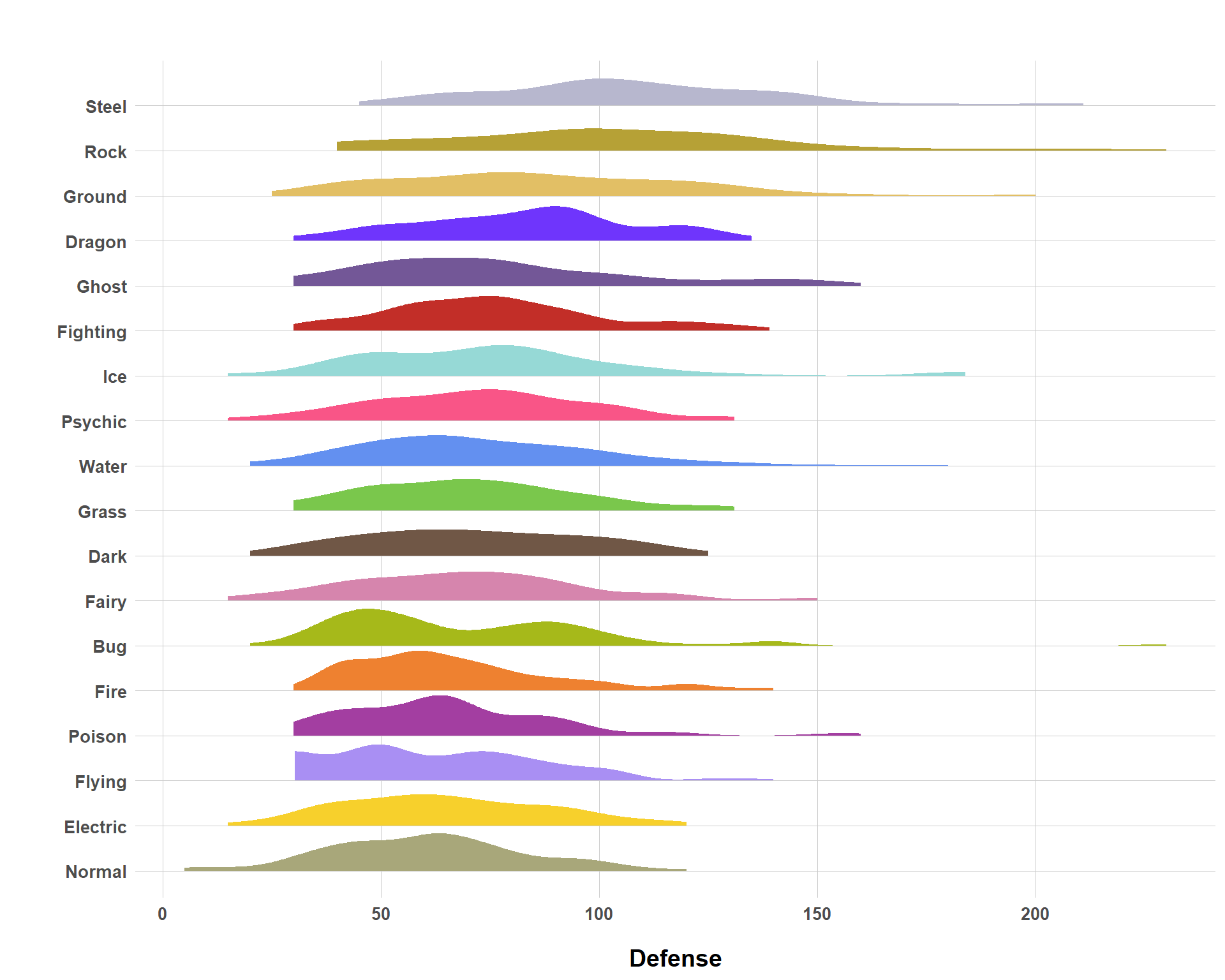 # Create a Data Frame of Level 1, 2, and 3 Evolutionpokedex <- pokedex |>group_by(evo_set) |>mutate(level1 =as.integer(row_number() ==1),level2 =as.integer(row_number() ==2),level3 =as.integer(row_number() ==3) ) |>ungroup()# Create a Long-Form Data Set for Typingpokedex_long <- pokedex |>pivot_longer(cols =starts_with("type_"),names_to ="type_name",values_to ="has_type" ) |># This Omits Copies Where a Given Pokemon Does Not Belong to a Given Type# For Dual-Typing, Two Copies Are Made for the Pokemonfilter(has_type ==1) |>mutate(type_name =str_remove(type_name, "type_"))# Distribution Plot by Defenseggplot(pokedex_long, aes(x = defense,y =fct_reorder(type_name, defense, .fun = mean),fill = type_name )) +stat_halfeye(adjust =0.7,point_interval =NULL ) +scale_y_discrete(labels = type_names) +scale_fill_manual(values = type_colors) +blog_theme() +labs(title ="",x ="Defense",y ="" ) +theme(legend.position ="none")