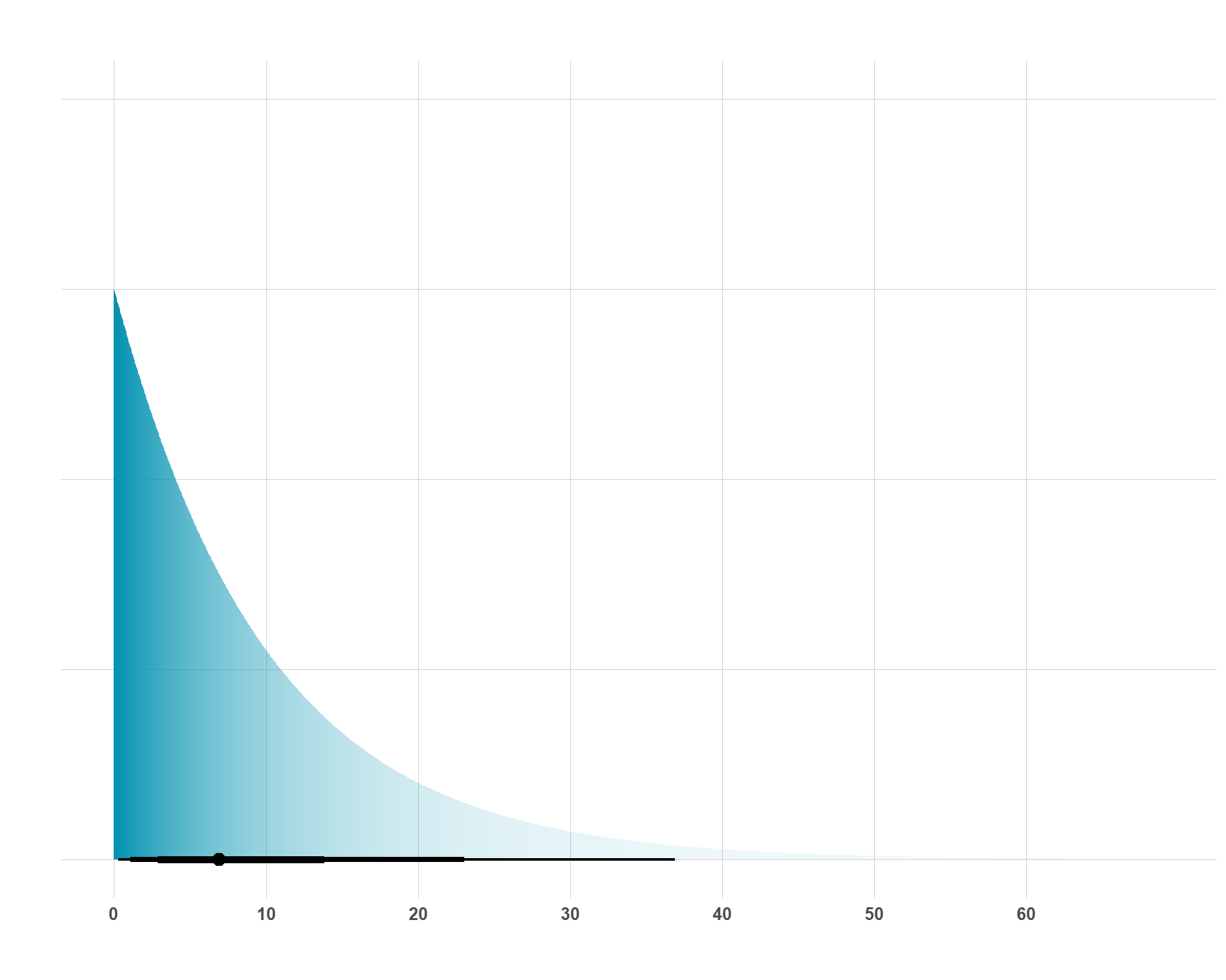 Lastly, I need to think about the amount of residual variance that remains if all I include in this model to predict life expectancy is GPD per capita. Here, I’ll stick with my assumptions that the standard deviation of life expectancy is 10 years (as I assumed with the intercept.) Accordingly, if I divide 1 / 10, I get \(\lambda\), so I will be setting: