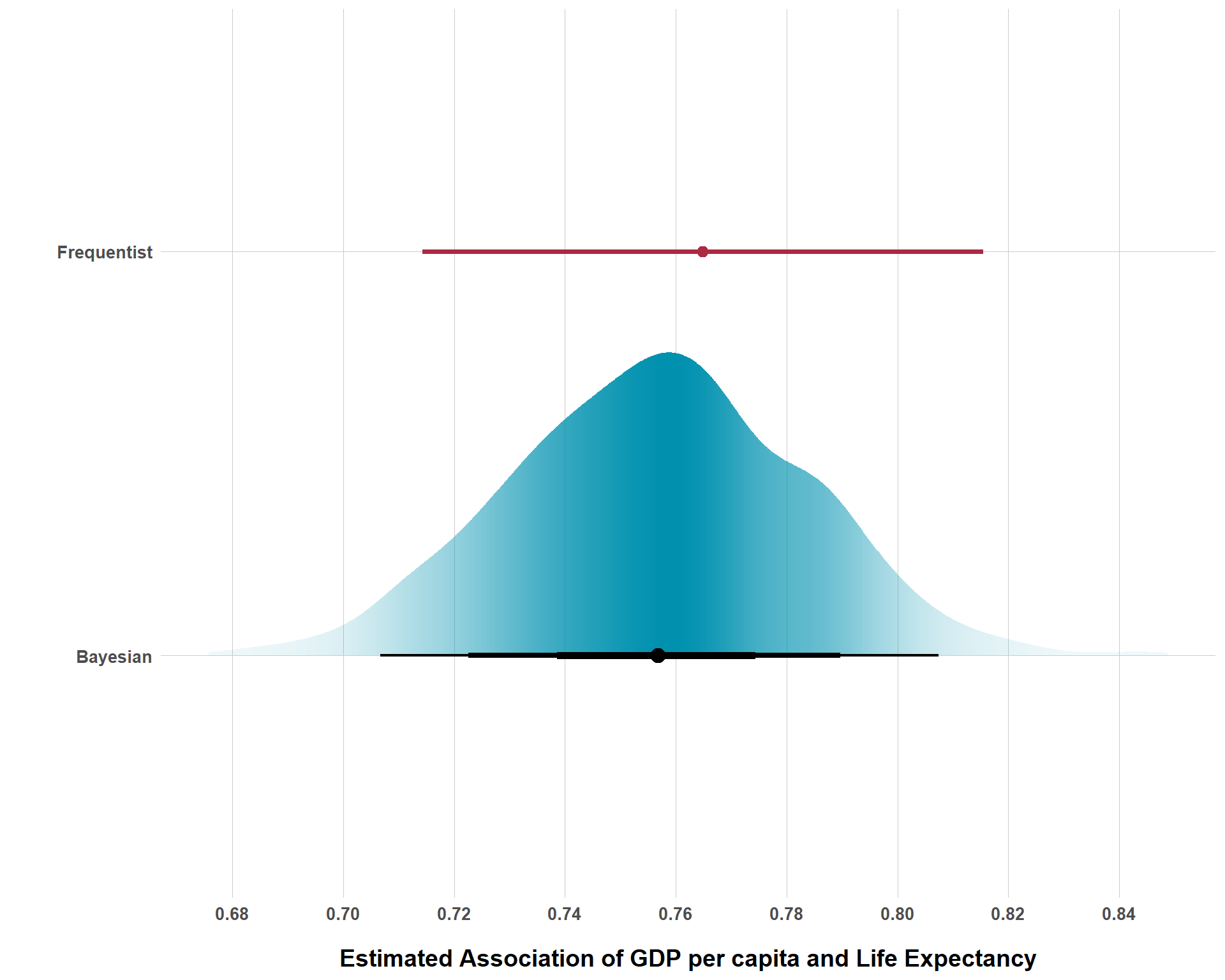 # Bayesian Modelmod_fit <-brm(data = gap,family = gaussian,formula = lifeExp ~ gdpPercap,prior = model_priors,chains =4, cores =4, iter =1000,seed =1234, backend ="cmdstanr",)# Extract Bayesian Info from the Modelbayes_draws <- mod_fit |>spread_draws(b_gdpPercap)bayes_df <- bayes_draws |>rename(estimate = b_gdpPercap) |>mutate(model ="Bayesian")# Frequentist Modelfreq_mod_fit <-lm(lifeExp ~ gdpPercap, data = gap)# Extract Frequentist Estimate and Confidence Intervalsfreq_ci <-confint(freq_mod_fit)["gdpPercap", ]freq_est <-coef(freq_mod_fit)["gdpPercap"]freq_df <-tibble(model ="Frequentist",estimate = freq_est,lower = freq_ci[1],upper = freq_ci[2])ggplot(bayes_df, aes(x = estimate, y = model)) +stat_halfeye(aes(slab_alpha =after_stat(pdf)),.width =c(0.95, 0.80, 0.50),interval_size_range =c(0.75, 2),point_interval = median_qi,fill = colors[2],fill_type ="segments", show.legend =FALSE,scale =0.75 ) +geom_pointinterval(data = freq_df,aes(x = estimate, y = model, xmin = lower, xmax = upper),color = colors[5],size =6 ) +scale_x_continuous(breaks =seq(from =0.68, to =0.88, by =0.02)) +scale_slab_alpha_continuous(range =c(0.05, 1)) +labs(x ="Estimated Association of GDP per capita and Life Expectancy",y ="" ) +blog_theme()