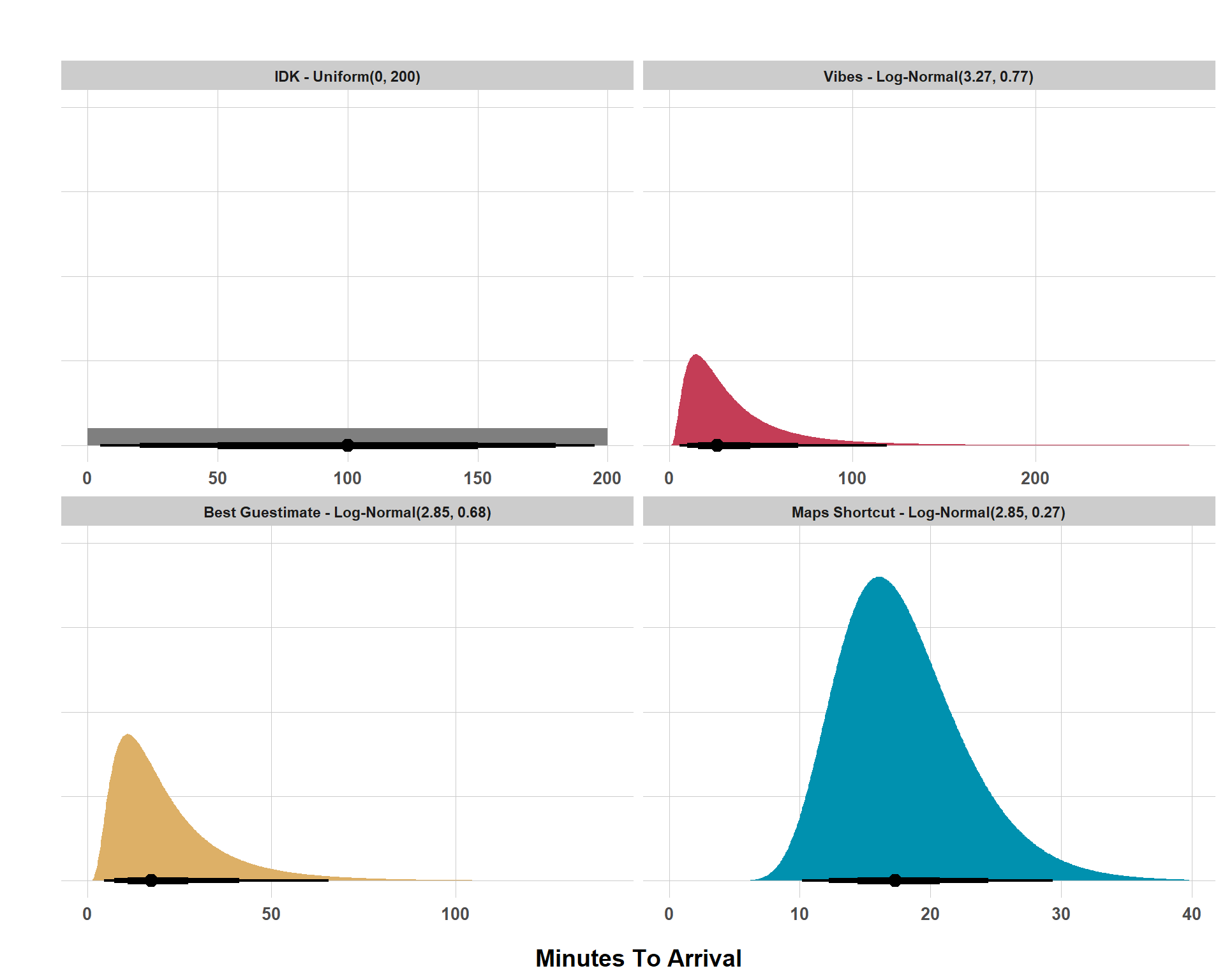 # Set Prior Assumptions for 4 Different Expectationslunch_priors <-c(prior(uniform(0, 200)),prior(lognormal(3.27, 0.77)),prior(lognormal(2.85, 0.68)),prior(lognormal(2.85, 0.27)))# Get a Data Frame of Distribution Datalunch_priors_df <- lunch_priors |>parse_dist() |>mutate(prior =case_when( prior =="uniform(0, 200)"~"IDK - Uniform(0, 200)", prior =="lognormal(3.27, 0.77)"~"Vibes - Log-Normal(3.27, 0.77)", prior =="lognormal(2.85, 0.68)"~"Best Guestimate - Log-Normal(2.85, 0.68)", prior =="lognormal(2.85, 0.27)"~"Maps Shortcut - Log-Normal(2.85, 0.27)" )) |>mutate(prior =fct_inorder(prior))ggplot(lunch_priors_df, aes(y =0, dist = .dist, args = .args)) +stat_halfeye(point_size =3, aes(slab_fill = prior),point_interval = median_qi, .width =c(0.95, 0.80, 0.50), interval_size_range =c(0.75, 2), show.legend =FALSE) +facet_wrap(~ prior, scales ="free_x") +scale_fill_manual(values = colors[c(6, 4, 3, 2)], aesthetics ="slab_fill", guide ="none") +labs(x ="Minutes To Arrival", y ="", title ="") +scale_y_continuous(labels =NULL) +blog_theme()