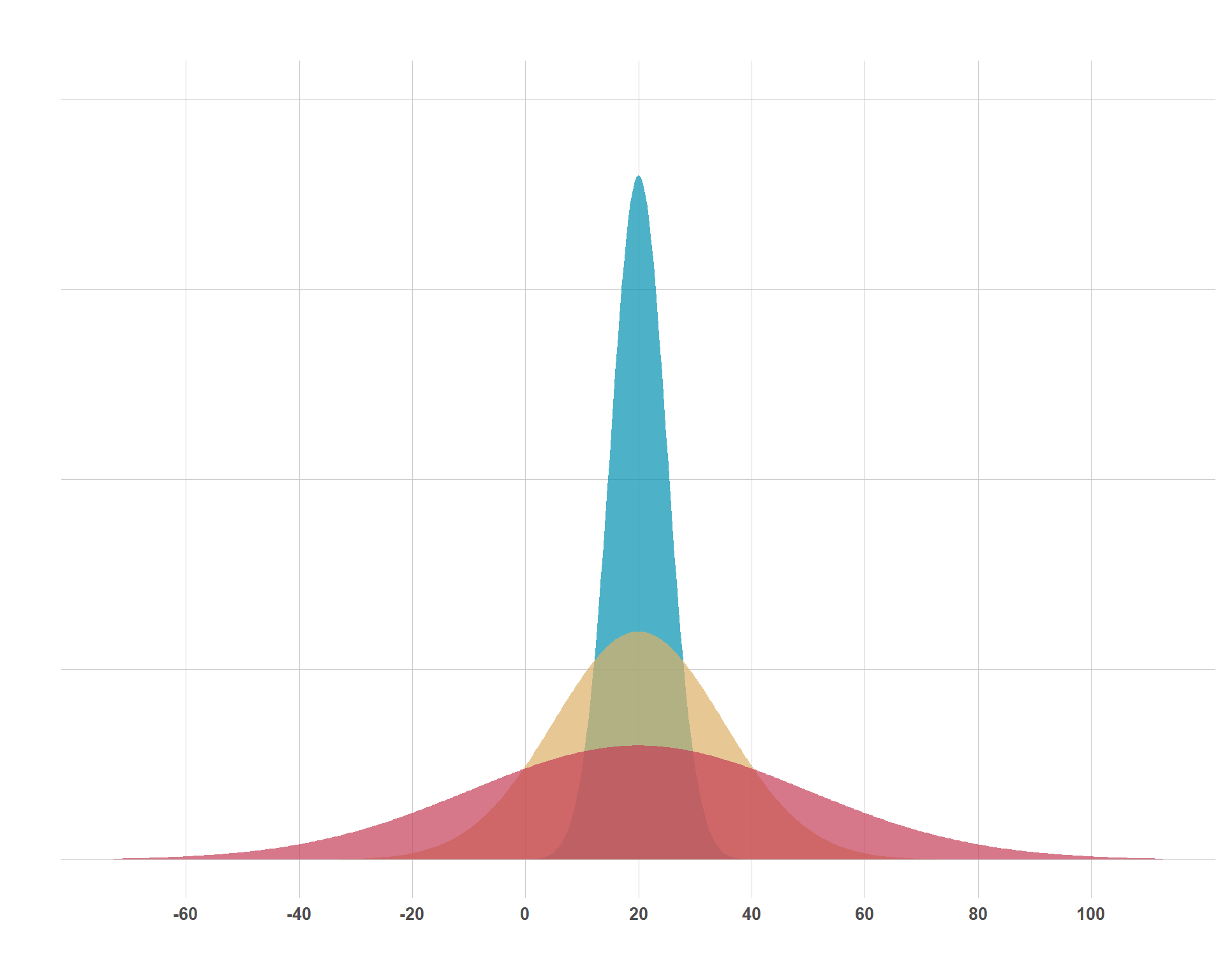 Mean of 20 and 68% of the data is within 20 \(\pm\) 15 and 95% of the data is roughly within 20 \(\pm\) 30. This is the yellow distribution.