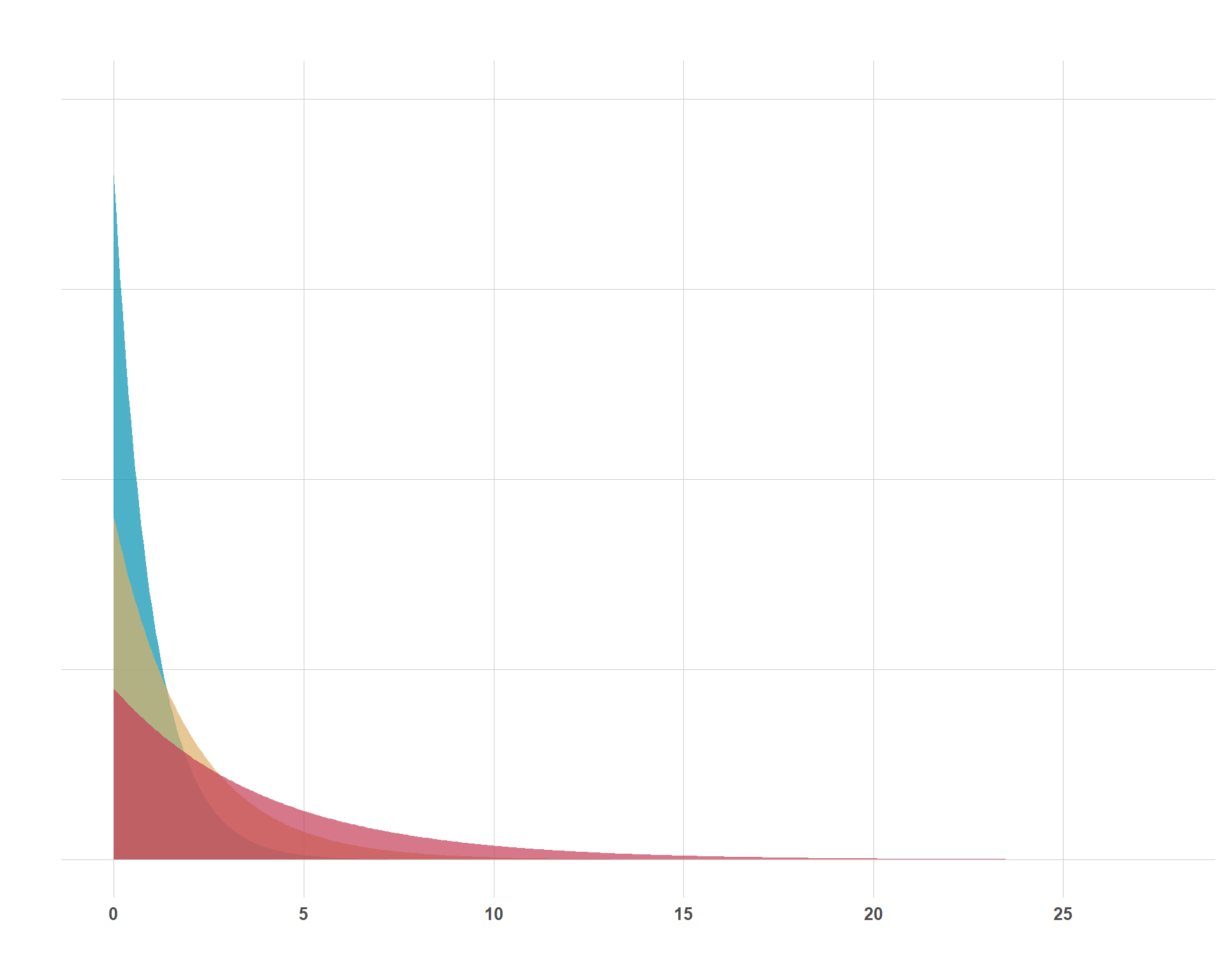 exponential_priors <-c(prior(exponential(0.25)),prior(exponential(0.5)),prior(exponential(1)))# You Could Also Do This# exponential_priors <- c(# prior(exponential(1/4)),# prior(exponential(1/2)),# prior(exponential(1/1))# )exponential_priors_df <- exponential_priors |>parse_dist() |>mutate(prior =fct_inorder(prior))ggplot(exponential_priors_df, aes(y =0, dist = .dist, args = .args)) +stat_slab(alpha =0.7, aes(slab_fill = prior)) +scale_fill_manual(values = colors[c(4, 3, 2)], aesthetics ="slab_fill", guide ="none") +labs(x ="", y ="", title ="") +scale_x_continuous(breaks =seq(0, 25, by =5)) +scale_y_continuous(labels =NULL) +blog_theme()