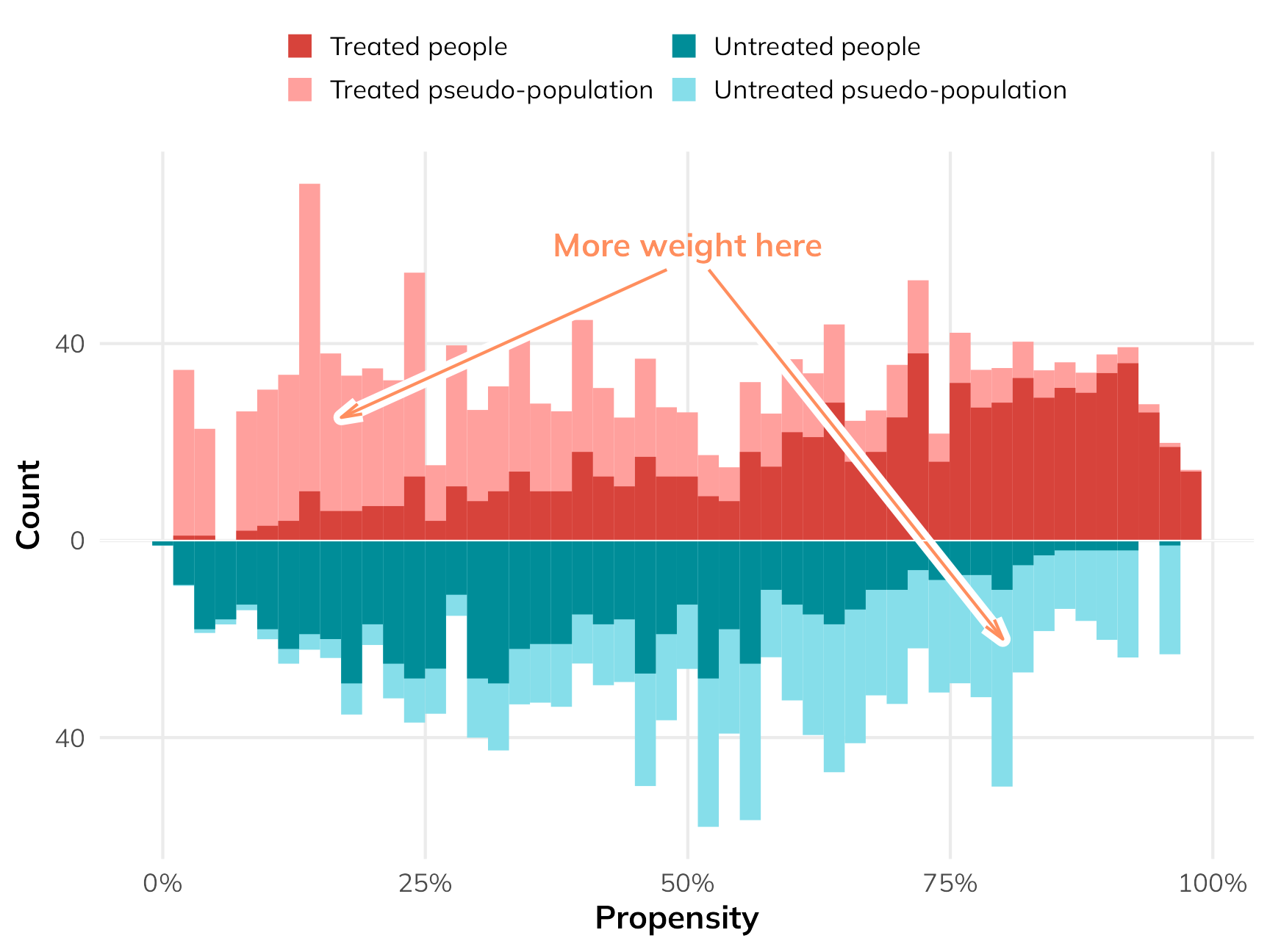 Inverse probability weighting (IPW) is used for all sorts of stuff. I was complaining earlier that MSMs aren’t a core part of the causal inference toolkit yet (even though they should be), but that is not the case for IPW. You can technically use IPWs for all sorts of things2, but, to be technically precise, it is inverse probability of treatment weighting (IPTW) that is popular in causal studies. Still, this is a nuance that is already assumed in a causal inference context, so I’m going to refer to them as “IPW”s from now on.