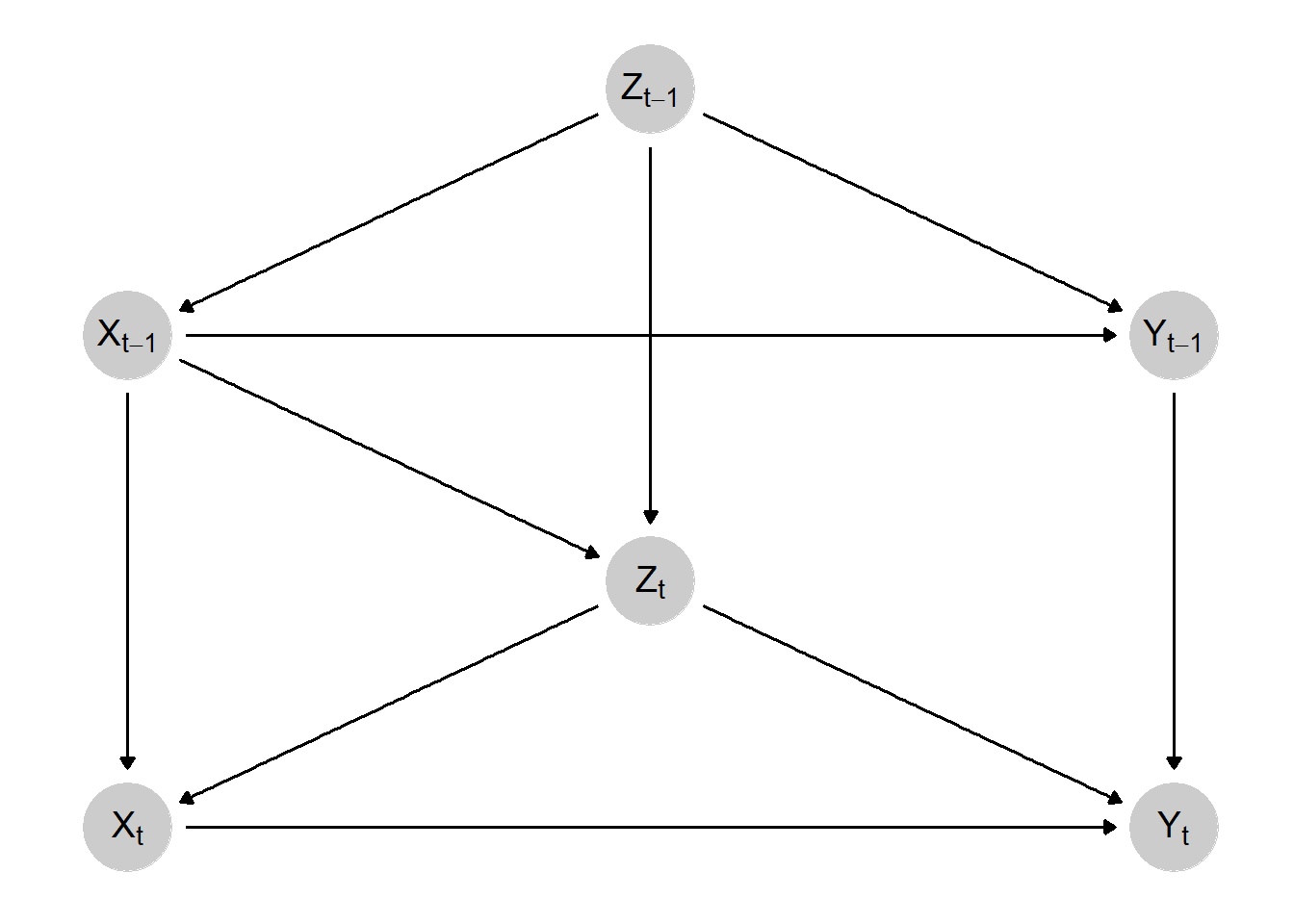 Nope! Take a look at \(X_{t}\) and \(Y_{t}\) for example. That is the contemporaneous effect (the effect in the current/immediate time period) that we often start with. \(Z\) does confound this relationship… but so does\(Y_{t-1}\). That is, prior outcome values impact both current outcome values and current exposure values, which go on to impact future outcome values. In other words, we have a feedback loop between our exposure and outcome.