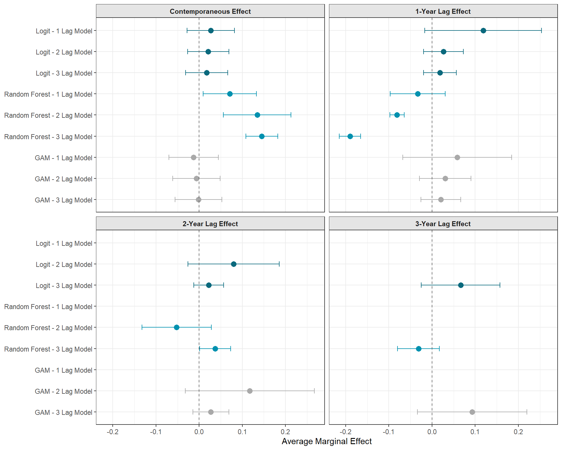ggplot(results, aes(x = estimate, y = method, color = method)) +geom_point(size =3) +geom_errorbarh(aes(xmin = conf.low, xmax = conf.high), width =0.25) +geom_vline(xintercept =0, linetype ="dashed", color ="grey40") +facet_wrap(~ term, labeller =labeller(term =c("v2cagenmob_bin"="Contemporaneous Effect","v2cagenmob_bin_lag1"="1-Year Lag Effect","v2cagenmob_bin_lag2"="2-Year Lag Effect","v2cagenmob_bin_lag3"="3-Year Lag Effect" ))) +labs(x ="Average Marginal Effect",y =NULL ) +scale_y_discrete(limits =rev(c("Logit - 1 Lag Model", "Logit - 2 Lag Model", "Logit - 3 Lag Model","Random Forest - 1 Lag Model", "Random Forest - 2 Lag Model", "Random Forest - 3 Lag Model","GAM - 1 Lag Model", "GAM - 2 Lag Model", "GAM - 3 Lag Model" ))) +scale_color_manual(values =c("Logit - 1 Lag Model"= colors[1],"Logit - 2 Lag Model"= colors[1],"Logit - 3 Lag Model"= colors[1],"Random Forest - 1 Lag Model"= colors[2],"Random Forest - 2 Lag Model"= colors[2],"Random Forest - 3 Lag Model"= colors[2],"GAM - 1 Lag Model"= colors[7],"GAM - 2 Lag Model"= colors[7],"GAM - 3 Lag Model"= colors[7] )) +theme_bw() +theme(legend.position ="none",strip.background =element_rect(fill ="grey90"),strip.text =element_text(face ="bold"))