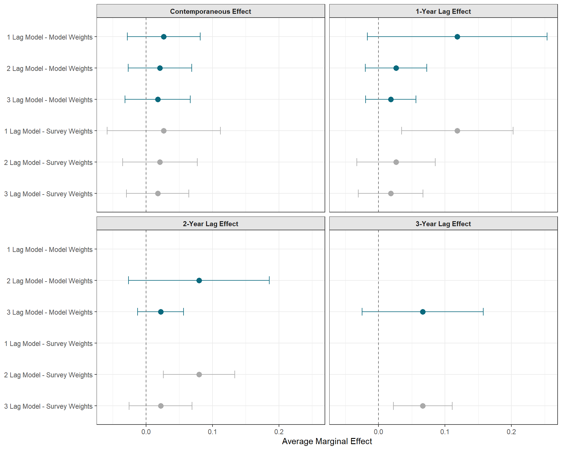 ggplot(results, aes(x = estimate, y = method, color = method)) +geom_point(size =3) +geom_errorbarh(aes(xmin = conf.low, xmax = conf.high), width =0.25) +geom_vline(xintercept =0, linetype ="dashed", color ="grey40") +facet_wrap(~ term, labeller =labeller(term =c("v2cagenmob_bin"="Contemporaneous Effect","v2cagenmob_bin_lag1"="1-Year Lag Effect","v2cagenmob_bin_lag2"="2-Year Lag Effect","v2cagenmob_bin_lag3"="3-Year Lag Effect" ))) +labs(x ="Average Marginal Effect",y =NULL ) +scale_y_discrete(limits =rev(c("1 Lag Model - Model Weights", "2 Lag Model - Model Weights", "3 Lag Model - Model Weights","1 Lag Model - Survey Weights", "2 Lag Model - Survey Weights", "3 Lag Model - Survey Weights" ))) +scale_color_manual(values =c("1 Lag Model - Model Weights"= colors[1],"2 Lag Model - Model Weights"= colors[1],"3 Lag Model - Model Weights"= colors[1],"1 Lag Model - Survey Weights"= colors[7],"2 Lag Model - Survey Weights"= colors[7],"3 Lag Model - Survey Weights"= colors[7] )) +theme_bw() +theme(legend.position ="none",strip.background =element_rect(fill ="grey90"),strip.text =element_text(face ="bold"))