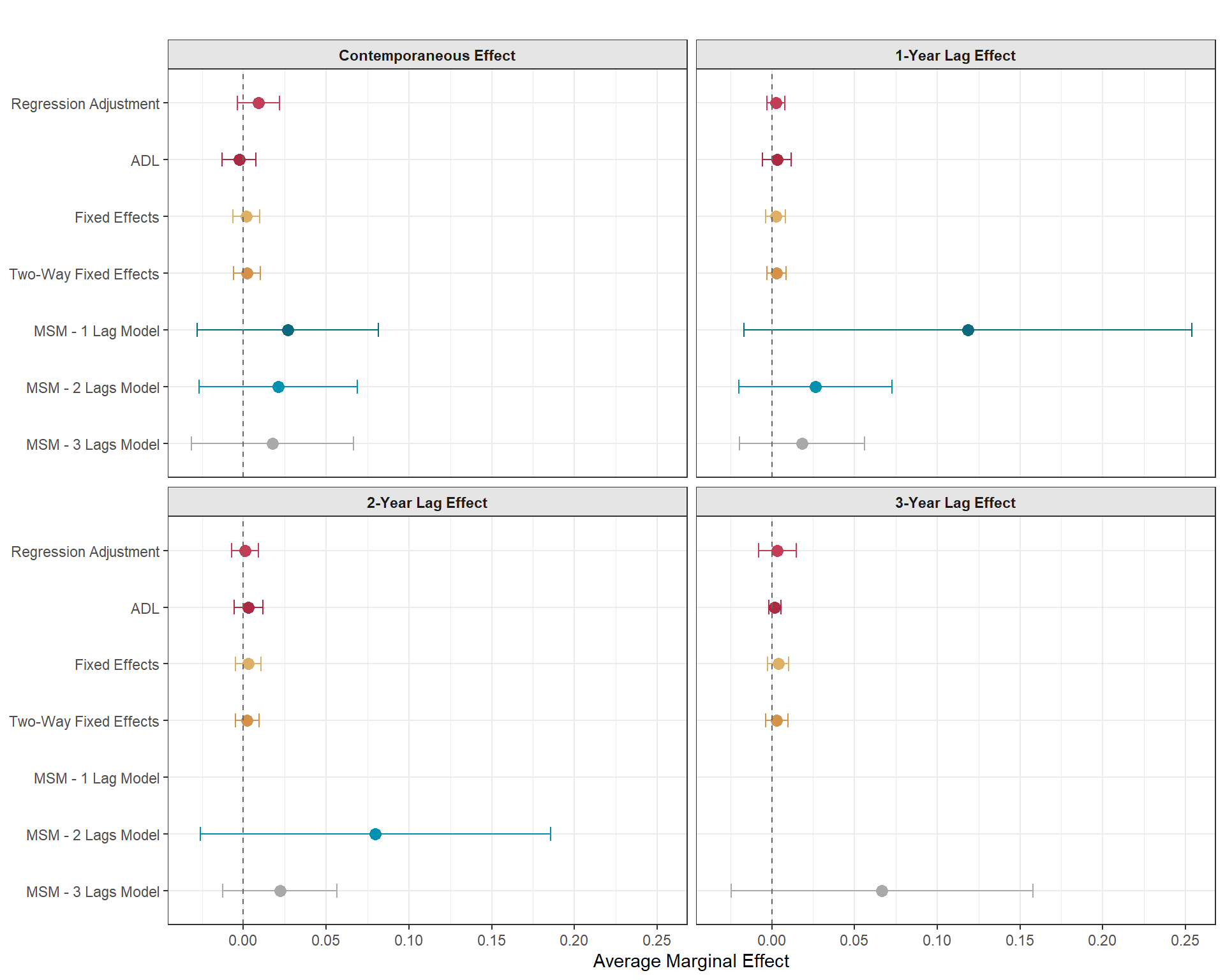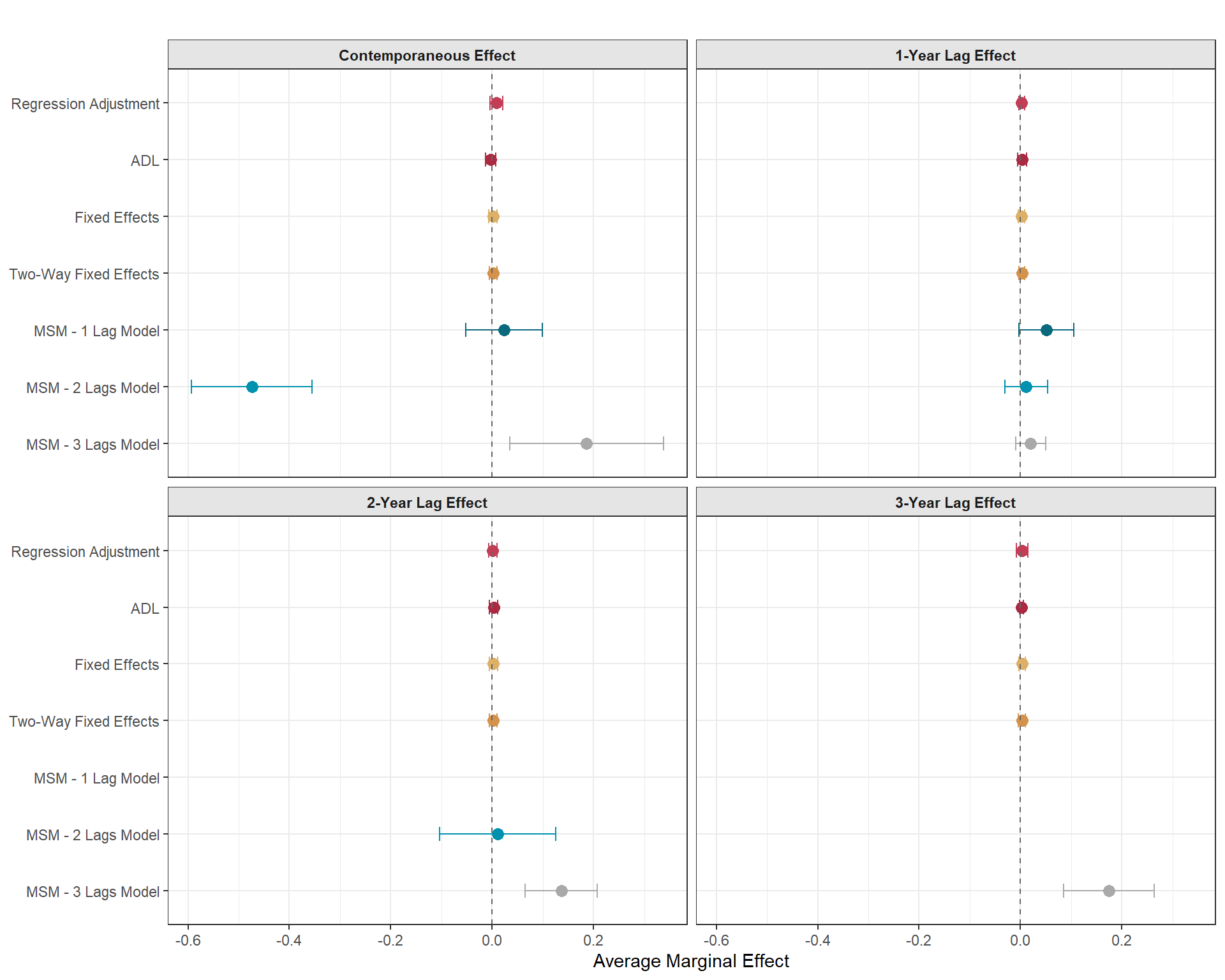 Now, let’s get to the fun part and look at how effect sizes change when we introduce different lag lengths and use alternative non-MSM methods to get a sense of how much results can change when we use things like regression adjustment, the ADL model, and fixed effects.
