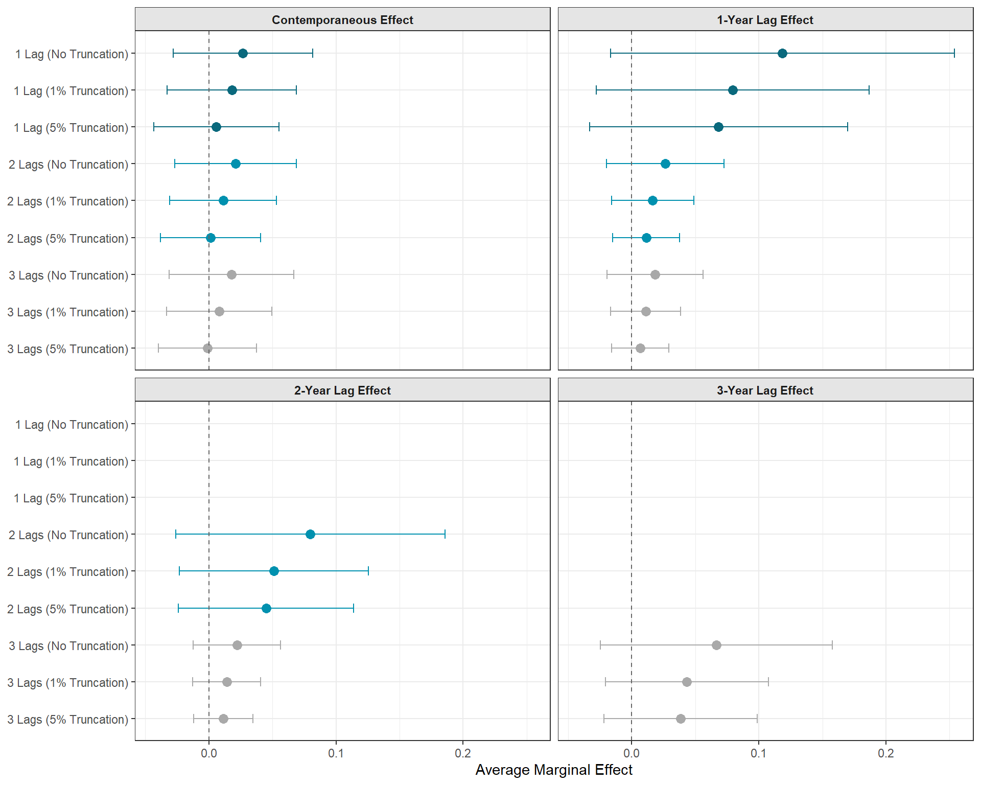 ggplot(results, aes(x = estimate, y = method, color = method)) +geom_point(size =3) +geom_errorbarh(aes(xmin = conf.low, xmax = conf.high), width =0.25) +geom_vline(xintercept =0, linetype ="dashed", color ="grey40") +facet_wrap(~ term, labeller =labeller(term =c("v2cagenmob_bin"="Contemporaneous Effect","v2cagenmob_bin_lag1"="1-Year Lag Effect","v2cagenmob_bin_lag2"="2-Year Lag Effect","v2cagenmob_bin_lag3"="3-Year Lag Effect" ))) +labs(x ="Average Marginal Effect",y =NULL ) +scale_y_discrete(limits =rev(c("1 Lag (No Truncation)", "1 Lag (1% Truncation)", "1 Lag (5% Truncation)","2 Lags (No Truncation)", "2 Lags (1% Truncation)", "2 Lags (5% Truncation)","3 Lags (No Truncation)", "3 Lags (1% Truncation)", "3 Lags (5% Truncation)" ))) +scale_color_manual(values =c("1 Lag (No Truncation)"= colors[1],"2 Lags (No Truncation)"= colors[2],"3 Lags (No Truncation)"= colors[7],"1 Lag (1% Truncation)"= colors[1],"2 Lags (1% Truncation)"= colors[2],"3 Lags (1% Truncation)"= colors[7],"1 Lag (5% Truncation)"= colors[1],"2 Lags (5% Truncation)"= colors[2],"3 Lags (5% Truncation)"= colors[7] )) +theme_bw() +theme(legend.position ="none",strip.background =element_rect(fill ="grey90"),strip.text =element_text(face ="bold"))